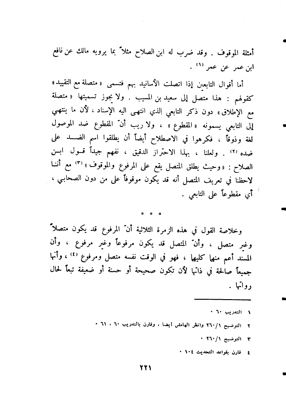 أما أقوال التابعين إذا اتصلت الأسانيد بهم فتسمى «متصلة مع التقييد» كقولهم: هذا متصل إلى سعيد بن المسيب. ولا يجوز تسميتها «متصلة مع الإطلاق» دون ذكر التابعي الذي انتهى إليه الإسناد، لأن ما ينتهي إلى التابعي يسمونه «المقطوع»، ولا ريب أن المقطوع ضد الموصول لغة وذوقًا، فكرهوا في الاصطلاح أيضًا أن يطلقوا اسم الضد على ضده (¬2). ولعلنا، بهذا الاحتراز الدقيق، نفهم جَيِّدًا قول ابن الصلاح: " «وَحَيْثُ يُطْلَقُ المُتَّصِلُ يَقَعُ عَلَى المَرْفُوعِ وَالمَوْقُوفِ» (¬3) مع أننا لاحظنا في تعريف المتصل أنه قد يكون موقوفًا على من دون الصحابي، أي مقطوعا على التابعي.