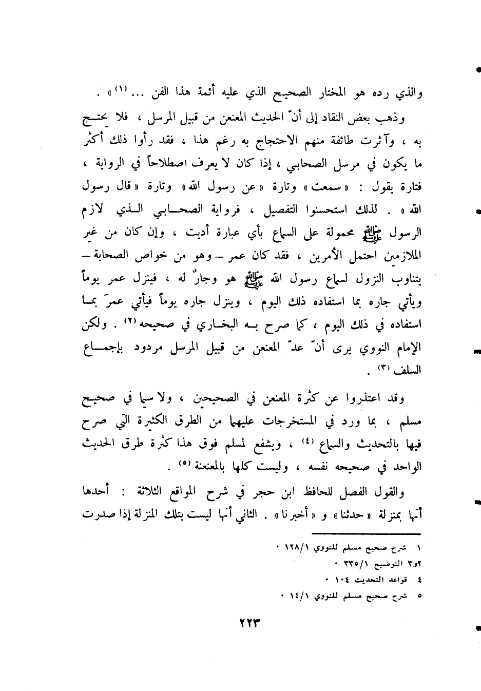 وذهب بعض النقاد إلى أن الحديث المعنعن من قبيل المرسل، فلا يحتج به، وآثرت طائفة منهم الاحتجاج به رغم هذا، فقد رأوا ذلك أكثر ما يكون في مرسل الصحابي، إذا كان لا يعرف اصطلاحًا في الرواية، فتارة يقول: «سَمِعْتُ» وتارة «عَنْ رَسُولِ اللهِ» وتارة «قَالَ رَسُولُ اللهِ». لذلك استحسنوا التفصيل، فرواية الصحابي الذي لازم الرسول - صَلََّى اللهُ عَلَيْهِ وَسَلَّمَ - محمولة على السماع بأي عبارة أديت، وإن كان من غير الملازمين احتمل الأمرين، فقد كان عمر - وهو من خواص الصحابة - يتناوب النزول لسماع رسول الله - صَلََّى اللهُ عَلَيْهِ وَسَلَّمَ - هو وجارٌ له، فينزل عمر يومًا ويأتي جاره بما استفاده ذلك اليوم، وينزل جاره يومًا فيأتي عمر بما استفاده في ذلك اليوم، كما صرح به البخاري في " صحيحه " (¬2). ولكن الإمام النووي يرى أن عَدَّ المعنعن من قبيل المرسل مردود بإجماع السلف (¬3).