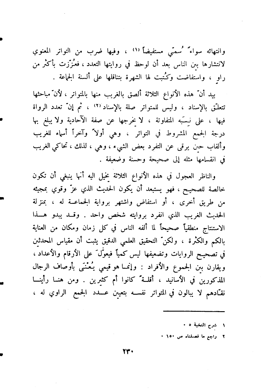بيد أن هذه الأنواع الثلاثة ألصق بالغريب منها بالمتواتر، لأن مباحثها تتعلق بالإسناد، وليس للمتواتر صلة بالإسناد (¬2)، ثم إن تعدد الرواة فيها، على نِسَبِهِ المتفاوتة، لا يخرجها عن صفة الاَحادية ولا يبلغ بها درجة الجمع المشروط في التواتر، وهي أولاً وآخراً أسماء للغريب وألقاب حين يرقى عن التفرد بعض الشيء، وهي، لذلك، تحاكي الغريب في انقسامها مثله إلى صحيحة وحسنة وضعيفة.