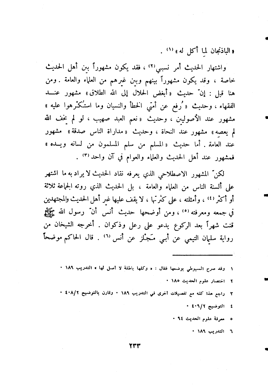لكن المشهور الاصطلاحي الذي يعرفه نقاد الحديث لا يراد به ما اشتهر على ألسنة الناس من العلماء والعامة، بل الحديث الذي روته الجماعة ثلاثة أو أكثر (¬4)، وأمثلته، على كثرتها، لا يقف عليها غير أهل الحديث والمجتهدين في جمعه ومعرفته (¬5)، ومن أوضحها حديث أنس «أَنَّ رَسُولَ اللهِ - صَلََّى اللهُ عَلَيْهِ وَسَلَّمَ - قَنَتَ شَهْرًا بَعْدَ الرُّكُوعِ يَدْعُو عَلَى رِعْلٍ وَذَكْوَانَ» أخرجه الشيخان من رواية سلمان التيمي عن أبي مَجْلِزٍ عن أنس (¬6). قال الحاكم مُوَضِّحًا