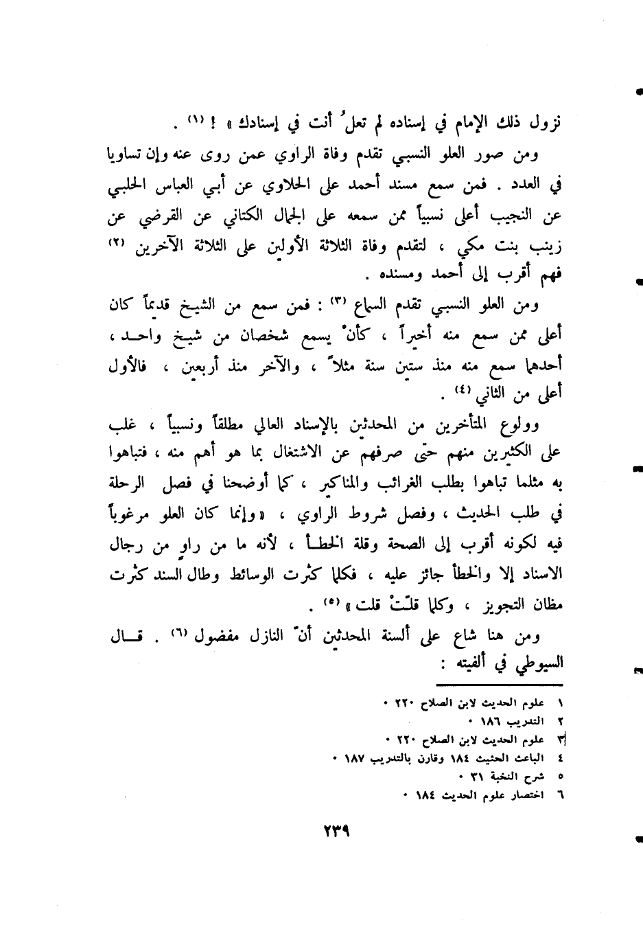وولوع المتأخرين من المحدثين بالإسناد العالي مطلقًا ونسبيًا، غلب على الكثيرين منهم حتى صرفهم عن الاشتغال بما هو أهم منه، فتباهوا به مثلما تباهوا بطلب الغرائب والمناكير، كما أوضحنا في فصل (الرحلة في طلب الحديث)، وفصل (شروط الراوى)، «وَإِنَّمَا كانَ العلوُّ مَرْغُوبًا فِيهِ لِكَوْنِهِ أَقْرَبَ إِلَى الصِحَّةِ وَقِلَّةِ الخَطَأِ؛ لأنَّهُ مَا مِنْ رَاوٍ مِنْ رِجَالِ الإِسْنَادِ إِلاَّ وَالخَطَأُ جَائِزٌ عَلَيْهِ، فَكُلَّمَا كَثُرَتْ الوَسَائِطُ وَطَالَ السَّنَدُ كَثُرَتْ مَظَانُّ التَّجْوِيزِ، وَكُلَّمَا قَلَّتْ قَلَّتْ» (¬5).