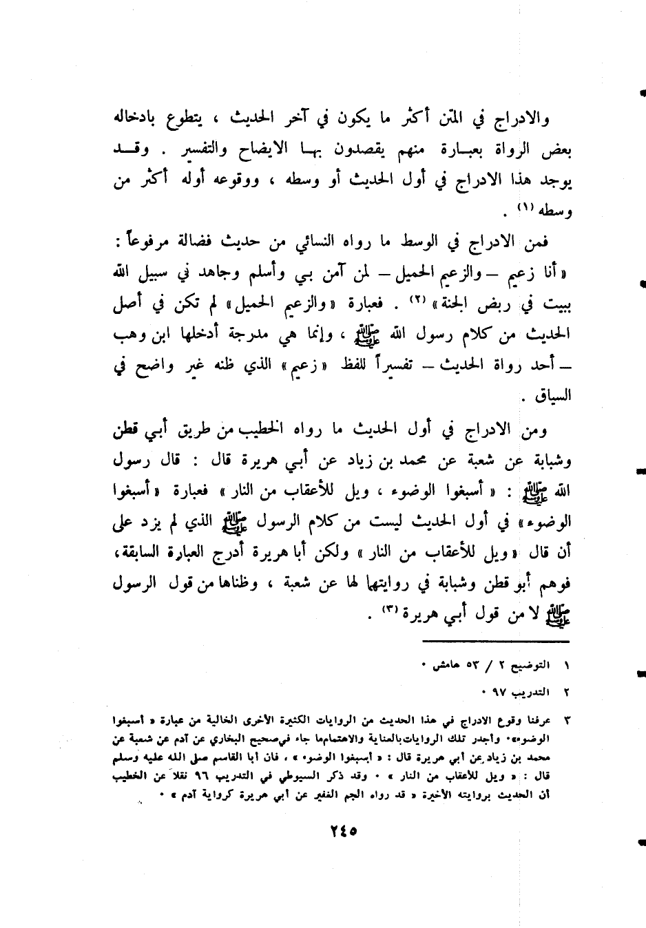 (¬3) عرفنا وقوع الإدراج في هذا الحديث من الروايات الكثيرة الأخرى الخالية من عبارة «أَسْبِغُوا الوُضُوءَ»، وأجدر تلك الروايات بالعناية والاهتمام بها ما جاء في " صحيح البخاري " عن آدم عن شعبة عن محمد بن زياد عن أبي هريرة قال: «أَسْبِغُوا الوُضُوءَ» فَإِنَّ أَبَا القَاسِمِ صَلَّى اللهُ عَلَيْهِ وَسَلَّمَ قَالَ: «وَيْلٌ لِلأَعْقَابِ مِنَ النَّارِ» (*). وقد ذكر السيوطي في " التدريب ": ص 96 نقلاً عن الخطيب أن الحديث بروايته الأخيرة «قَدْ رَوَاهُ الجَمُّ الْغَفِيرُ عَنْ أَبِي هُرَيْرَةَ كَرِوَايَةِ آدَمَ».