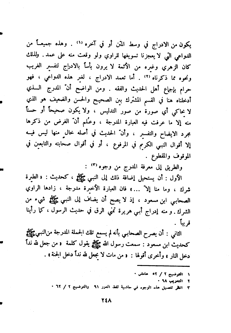 الأول: أن يستحيل إضافة ذلك إلى النبي - صَلََّى اللهُ عَلَيْهِ وَسَلَّمَ -، كحديث: «الطِّيَرَةُ شِرْكٌ وَمَا مِنَّا إِلاَّ ... » فإن العبارة الأخيرة مدرجة، زادها الراوي الصحابي ابن مسعود، إذ لا يصح أن يضاف إلى النبي - صَلََّى اللهُ عَلَيْهِ وَسَلَّمَ - شيء من الشرك. ومنه إدراج أبي هريرة تمني الرق في حديث الرسول، كما رأينا قريبًا.
