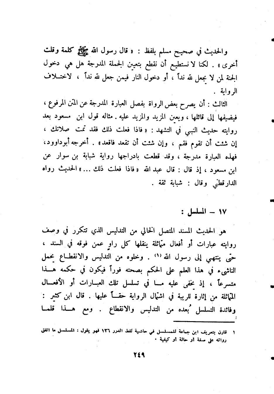 (¬1) قارن بتعريف ابن جماعة للمسلسل في " حاشية لقط الدرر ": ص 136 فهو يقول: «المُسَلْسَلُ مَا اِتَّفَقَ رُوَاتُهُ عَلَى صِفَةٍ أَوْ حالَةٍ أَوْ كَيْفِيَّةٍ».