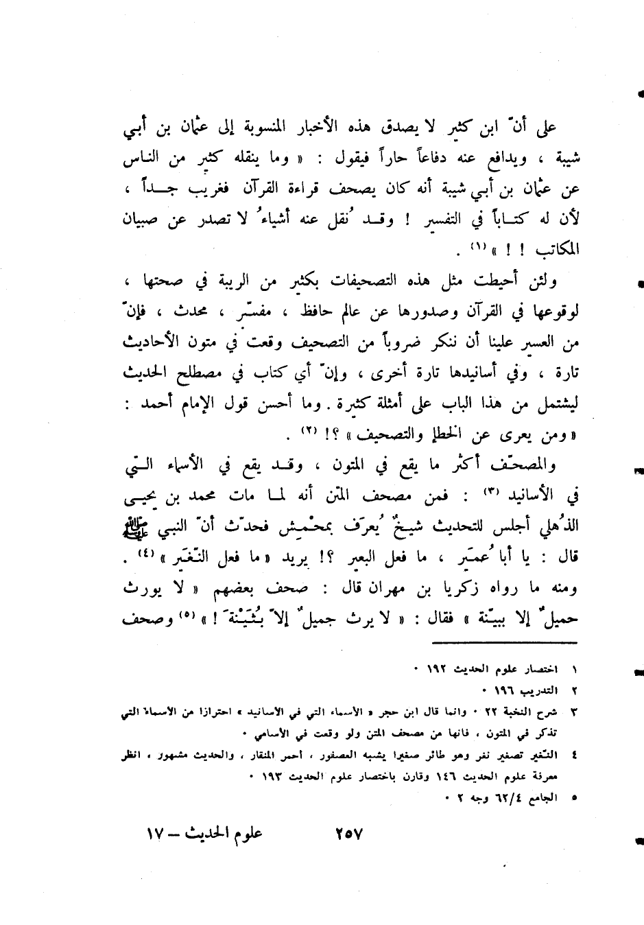 ولئن أحيطت مثل هذه التصحيفات بكثير من الريبة في صحتها، لوقوعها في القرآن وصدورها عن عالم حافظ، مفسر، محدث، فإن من العسر علينا أن ننكر ضروبًا من التصحيف وقعت في متون الأحاديث تارة، وفي أسانيدها تارة أخرى، وإن أي كتاب في مصطلح الحديث ليشتمل من هذا الباب على أمثلة كثيرة. وما أحسن قول الإمام أحمد: «وَمَنْ يَعْرَى عَنِ الْخَطَأِ وَالتَّصْحِيفِ»؟! (¬2).