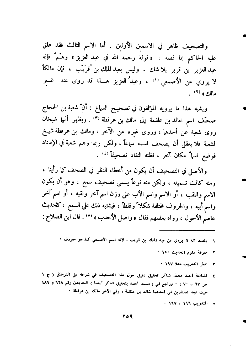 (¬4) للعلامة أحمد محمد شاكر تحقيق دقيق حول هذا التصحيف في " شرحه على الترمذي ": (ج 1 ص 67 - 70). وراجع في (" مسند أحمد " بتحقيق شاكر أيضًا) الحديثين رقم 928 و 989 حيث تجد إسنادين في أحدهما خالد بن علقمة، وفي الآخر مالك بن عرفطة.