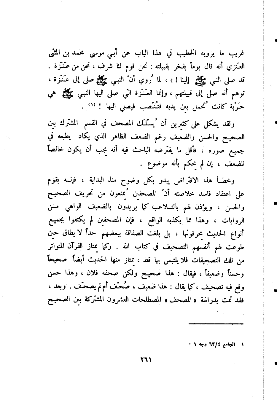 وخطأ هذا الافتراض يبدو بكل وضوح منذ البداية، فإنه يقوم على اعتقاد فاسد خلاصته أن المصحفين يُمْنَعُونَ من تحريف الصحيح والحسن، ويؤذن لهم بالتلاعب كما يريدون بالضعيف الواهي من الروايات، وهذا مما يكذبه الواقع، فإن المصحفين لم يكتفوا بجميع أنواع الحديث يحرفونها، بل بلغت الصفاقة ببعضهم حَدًّا لا يطاق حين طوعت لهم أنفسهم التصحيف في كتاب الله. وكما يمتاز القرآن المتواتر من تلك التصحيفات فلا يلتبس بها قط، يمتاز منها الحديث أيضًا صحيحًا وحسنًا وضعيفًا، فيقال: هذا صحيح ولكن صحفه فلان، وهذا حسن وقع فيه تصحيف، كما يقال: هذا ضعيف، صُحِّفَ أَمْ لَمْ يُصَحَّفْ. وبعد، فقد تمت بدراسة «المصحف» المصطلحات العشرون المشتركة بين الصحيح
