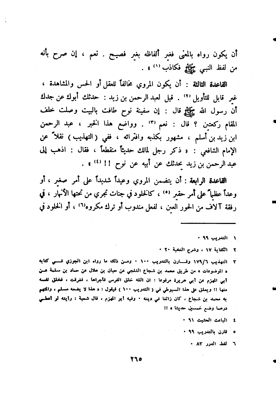 القاعدة الرابعة: أن يتضمن المروي وعيدًا شديدًا على أمر صغير، أو وعدًا عظيمًا على أمر حقير (¬5)، كالخلود في جنات تجري من تحتها الأنهار، في رفقة آلاف من الحور العين، لفعل مندوب أو ترك مكروه (¬6)، أو الخلود في