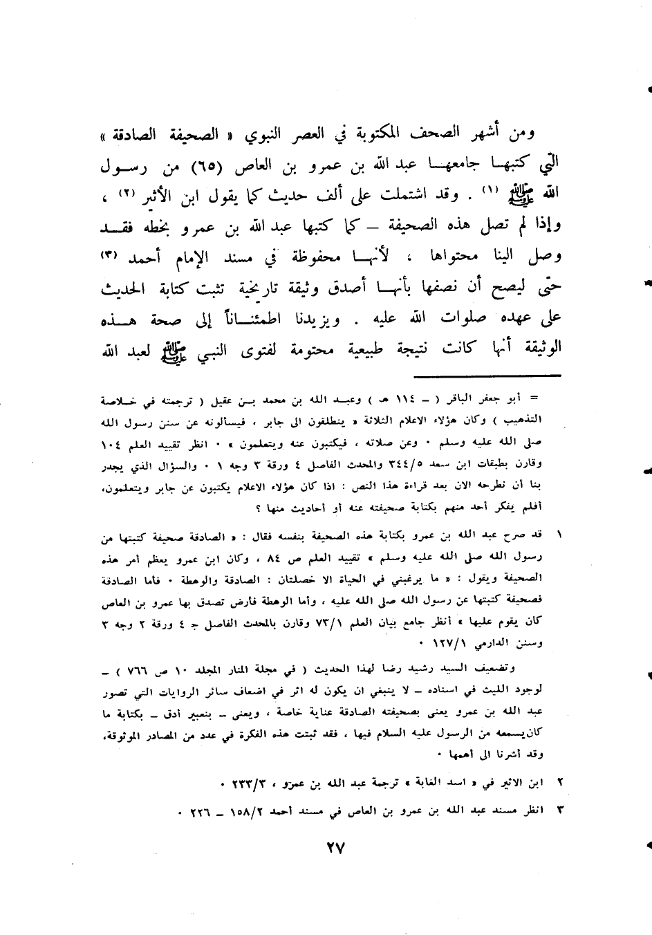 وتضعيف السيد رشيد رضا لهذا الحديث (في مجلة " المنار ": المجلد 10 ص 766) - لوجود الليث في إسناده - لا ينبغي أنْ يكون له أثر في إضعاف سائر الروايات التي تُصَوِّرُ عبد الله بن عمرو يعني بصحفته الصادقة عناية خاصة، ويعنى - بتعبير أدق - بكتابة ما كان يسمعه من الرسول - عَلَيْهِ السَّلاَمُ - فيها، فقد ثبتت هذه الفكرة في عدد من المصادر الموثوقة وقد أشرنا إلى أهمها.