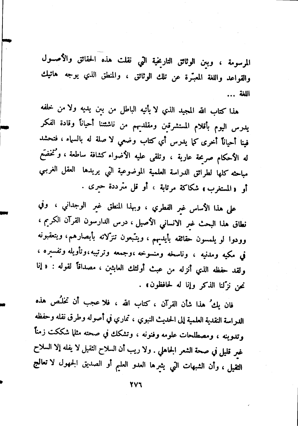 هذا كتاب الله المجيد الذي لا يأتيه الباطل من بين يديه ولا من خلفه يدرس اليوم بأقلام المستشرقين ومقلديهم من ناشئتنا أحيانًا وقادة الفكر فينا أحيانًا أخرى كما يدرس أي كتاب وضعي لا صلة له بالسماء، فتحشد له الأحكام صريحة عارية، وتلقى عليه الأضواء كشافة ساطعة، وَتُخْضَعَ مَبَاحِثُهُ كلها لطرائق الدراسة العلمية الموضوعية التي يريدها العقل الغربي أو «المستغرب»، شكاكة مرتابة، أو قل مترددة حيرى.