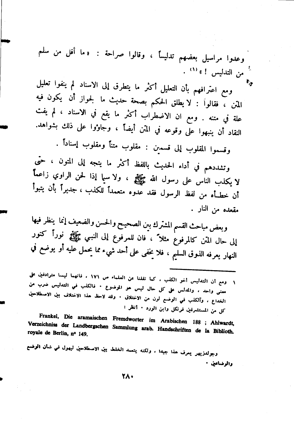 (¬1) ومع أن التدليس أخو الكذب، كما نقلنا عن العلماء ص 171، فإنهما ليسا مترادفين على معنى واحد، والمدلس على كل حال ليس هو الموضوع. فالكذب في التدليس ضرب من الخداع، والكذب في الوضع لون من الاختلاق. وقد لاحظ هذا الاختلاف بين الاصطلاحين كل من المستشرقين فرنكل وابن الورد. انظر:
