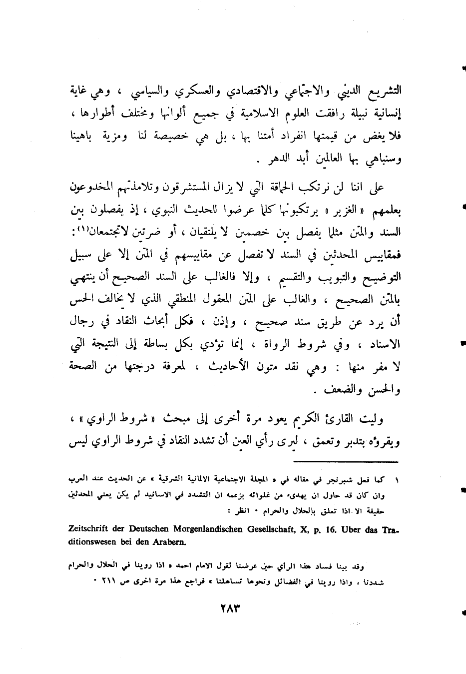 (¬1) كما فعل شبرنجر في مقاله في، " المجلة الاجتماعية الألمانية الشرقية " عن الحديث عند العرب وإن كان قد حاول أن يهدئ من غلوائه بزعمه أن التشدد في الأسانيد لم يكن يعني المحدثين حقيقة إلا إذا تعلق بالحلال والحرام، انظر: