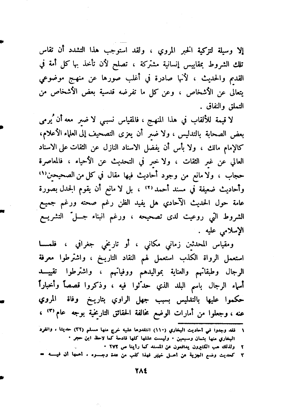 لا قيمة للألقاب في هذا المنهج، فالمقياس نسبي لا ضير معه أن يُرْمَى بعض الصحابة بالتدليس، ولا ضير أن يعزى التصحيف إلى العلماء الأعلام، كالإمام مالك، ولا بأس أن يفضل الإسناد النازل عن الثقات على الإسناد العالي عن غير الثقات، ولا خير في التحديث عن الأحياء، فالمعاصرة حجاب، ولا مانع من وجود أحاديث فيها مقال في كل من " الصحيحين " (¬1)، وأحاديث ضعيفة في " مسند أحمد " (¬2)، بل لا مانع أن يقوم الجدل بصورة عامة حول الحديث الآحادى هل يفيد الظن رغم صحته ورغم جميع الشروط التي روعيت لدى تصحيحه، ورغم انبناء جل التشريع الإسلامي عليه.