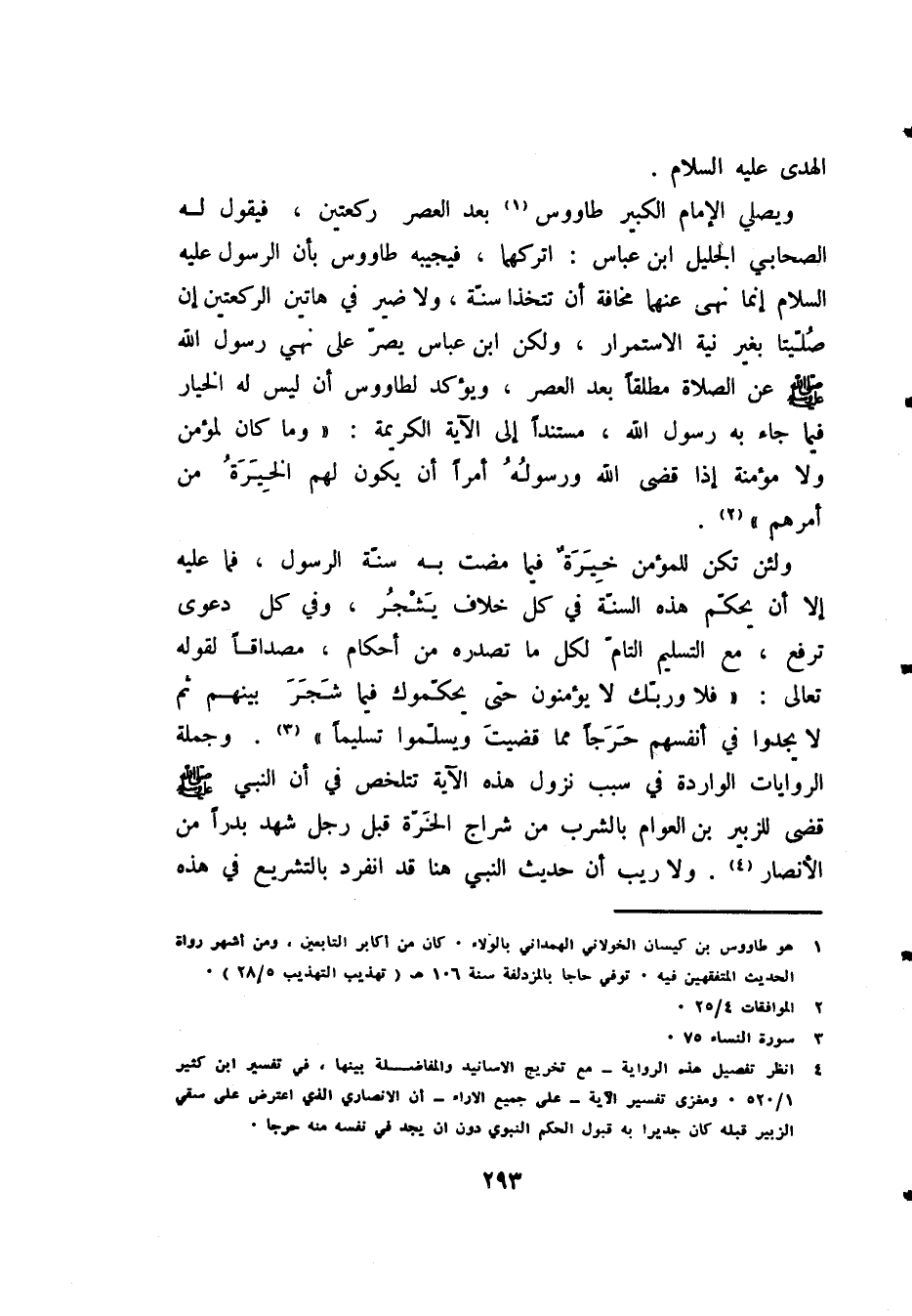 ويصلي الإمام الكبير طاووس (¬1) بعد العصر ركعتين، فيقول له الصحابي الجليل ابن عباس: اتركهما، فيجيبه طاووس بأن الرسول - عَلَيْهِ السَّلاَمُ - إنما نهى عنهما مخافة أَنْ تُتَّخَذَا سُنَّةً، ولا ضير في هاتين الركعتين إن صُلِّيَّتَا بغير نية الاستمرار، ولكن ابن عباس يُصِرُّ على نهي رسول الله - صَلََّى اللهُ عَلَيْهِ وَسَلَّمَ - عن الصلاة مطلقًا بعد العصر، ويؤكد لطاووس أن ليس له الخيار، فما جاء به رسول الله، مستندًا إلى الآية الكريمة: " {وَمَا كَانَ لِمُؤْمِنٍ وَلاَ مُؤْمِنَةٍ إِذَا قَضَى اللَّهُ وَرَسُولُهُ أَمْرًا أَنْ يَكُونَ لَهُمُ الْخِيَرَةُ مِنْ أَمْرِهِمْ} (¬2) [الأحزاب: 36].