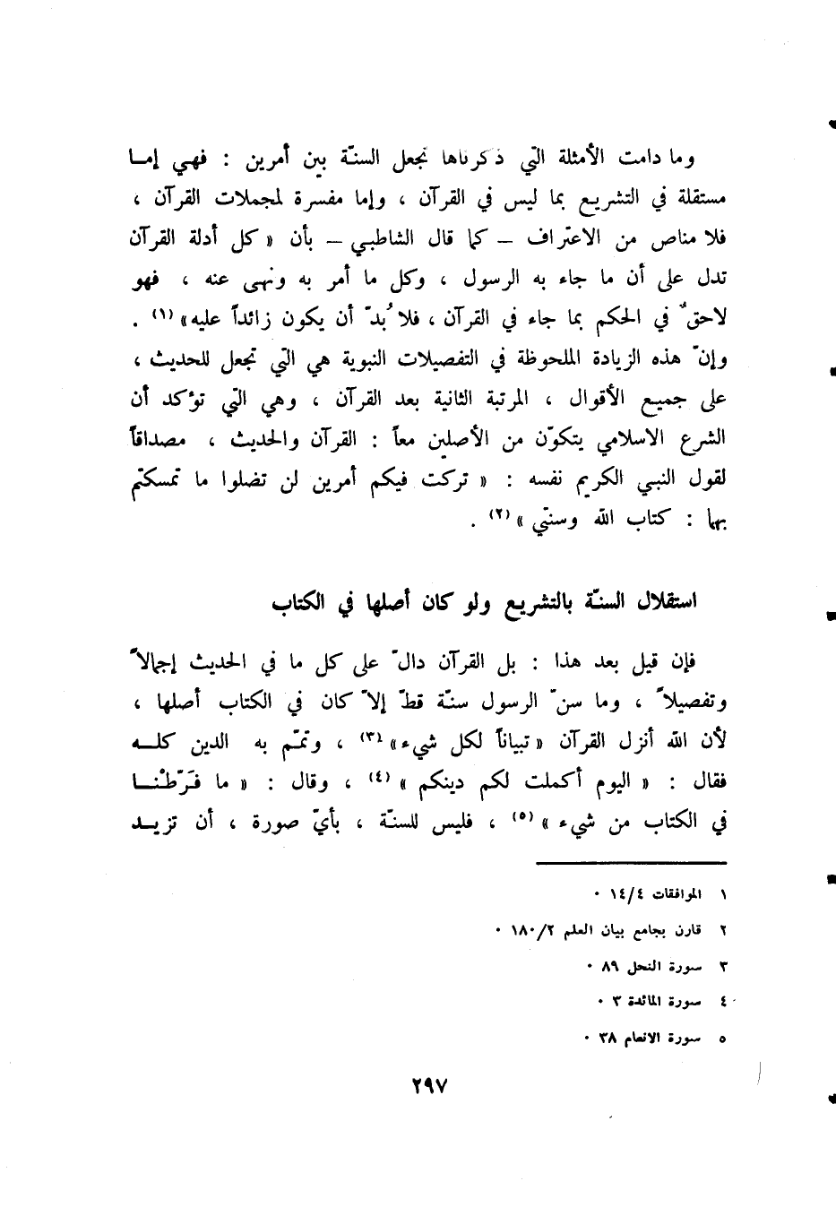 وما دامت الأمثلة التي ذكرناها تجعل السُنَّةَ بين أمرين: فهي إما مستقلة في التشريع بما ليس في القرآن، إما مفسرة لمجملات القرآن، فلا مناص من الاعتراف - كما قال الشاطبي - بأن «[أَدِلَّةُ] القُرْآنِ تَدُلُّ عَلَى أَنَّ كُلَّ مَا جَاءَ بِهِ الرَّسُولُ وَكُلَّ مَا أَمَرَ بِهِ وَنَهَى، فَهُوَ لاَحِقٌ فِي الحُكْمِ بِمَا جَاءَ فِي القُرْآنِ، فَلاَ بُدَّ أَنْ يَكُونَ زَائِدًا عَلَيْهِ» (¬1).