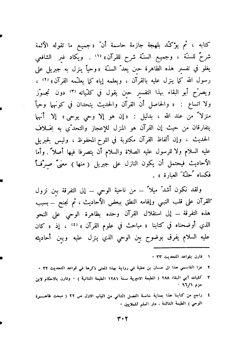 كتابه، ثم يؤكد بلهجة جازمة حاسمة أن «جَمِيعَ مَا تَقُولُهُ الأَئِمَّةُ شَرْحٌ لِلْسُنَّةِ، وَجَمِيعُ السُنَّةِ شَرْحٌ لِلْقُرْآنِ» (¬1). ويكاد غير الشافعي يغلو في تفسير هذه الظاهرة حين يَعُدُّ السُنَّةَ «وَحْيًا يَنْزِلُ بِهِ جِبْرِيلُ عَلَى رَسُولِ اللهِ كَمَا يَنْزِلُ عَلَيْهِ بِالقُرْآنِ، وَيُعَلِّمُهُ إِيَّاهُ كَمَا يُعَلِّمُهُ القُرْآنَ» (¬2)، ويصرح أبو البقاء بهذا التفسير حين يقول في " كلياته " (¬3) دون تَجَوُّزٍ وَلاَ اتِّسَاعٍ: «وَالحَاصِلُ أَنَّ القُرْآنَ وَالحَدِيثَ يَتَّحِدَانِ فِي كَوْنِهِمَا وَحْيًا مُنَزَّلاً مِنْ عِنْدِ اللهِ بِدَلِيلِ: {إِنْ هُوَ إِلاَّ وَحْيٌ يُوحَى} [النجم: 4] إِلاَّ أَنَّهُمَا يَتَفَارَقَانِ مِنْ حَيْثُ إِنَّ القُرْآنَ هُوَ المُنَزَّلُ لِلإِعْجَازِ وَالتحَِّدي بِهِ بِخِلاَف الحَدِيثِ، وَإِنَّ أَلْفَاظَ القُرْآن مَكْتُوبَةٌ فِي اللَّوْحِ المَحْفُوظِ، وَلَيْسَ لِجِبْرِيلَ عَلَيْهِ السَّلاَمُ وَلاَ لِلْرَّسُولِ عَلَيْهِ الصَّلاَةُ وَالسَّلاَمُ أََنْ يَتَصَرَّفَا فِيهَا أَصْلاً. وَأَمَّا الأَحَادِيثُ فَيُحْتَمَلُ أَنْ يَكُونَ النَّازِلُ عَلَى جِبْرِيلَ مَعْنًى صِرْفًا فَكَسَاهُ حلَّةَ العِبَارَةِ».