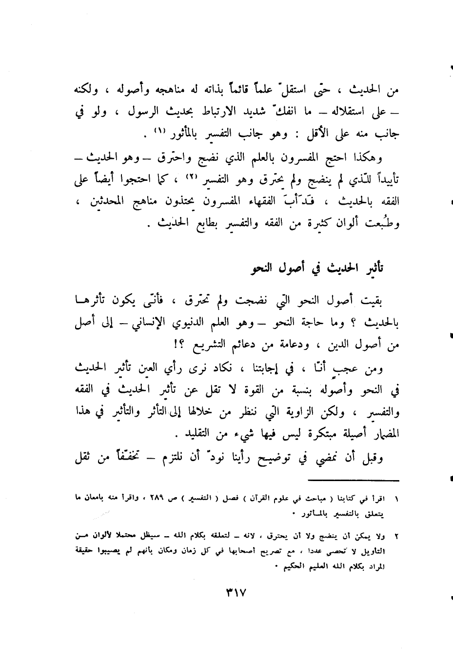 ومن عَجَبٍ أَنَّا، في إجابتنا، نكاد نرى رأي العين تأثير الحديث في النحو وأصوله بنسبة من القوة لا تقل عن تأثير الحديث في الفقه والتفسير، ولكن الزاوية التي ننظر من خلالها الى التأثر والتأثير في هذا المضمار أصيلة مبتكرة ليس فيها شيء من التقليد.