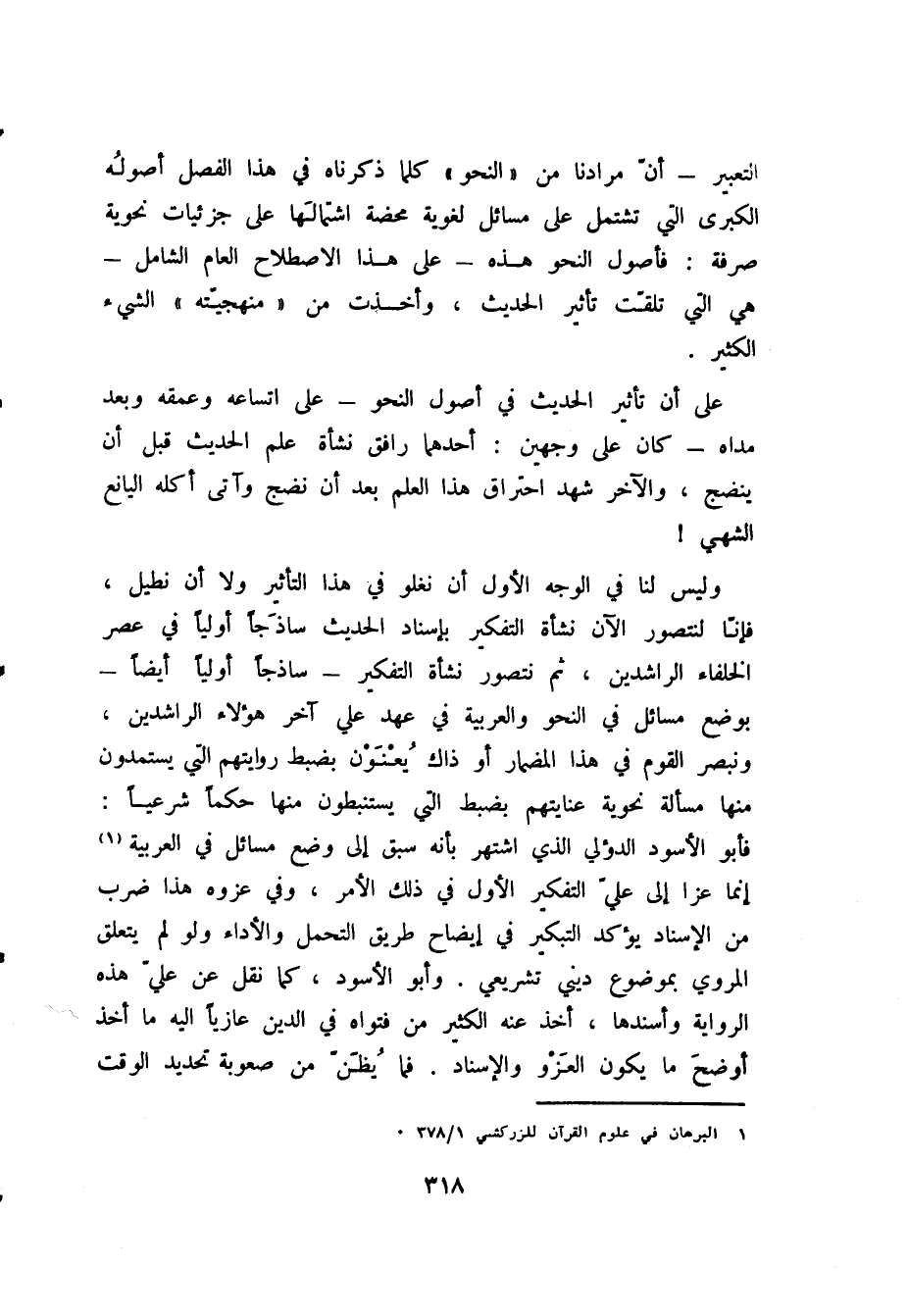 التعبير - أن مرادنا من «النحو» كلما ذكرناه في هذا الفصل أصوله الكبرى التي تشتمل على مسائل لغوية محضة اشتمالها على جزئيات نحوية صرفة: فأصول النحو هذه - على هذا الاصطلاح العام الشامل - هي التي تلقت تأثير الحديث، وأخذت من «منهجيته» الشيء الكثير.