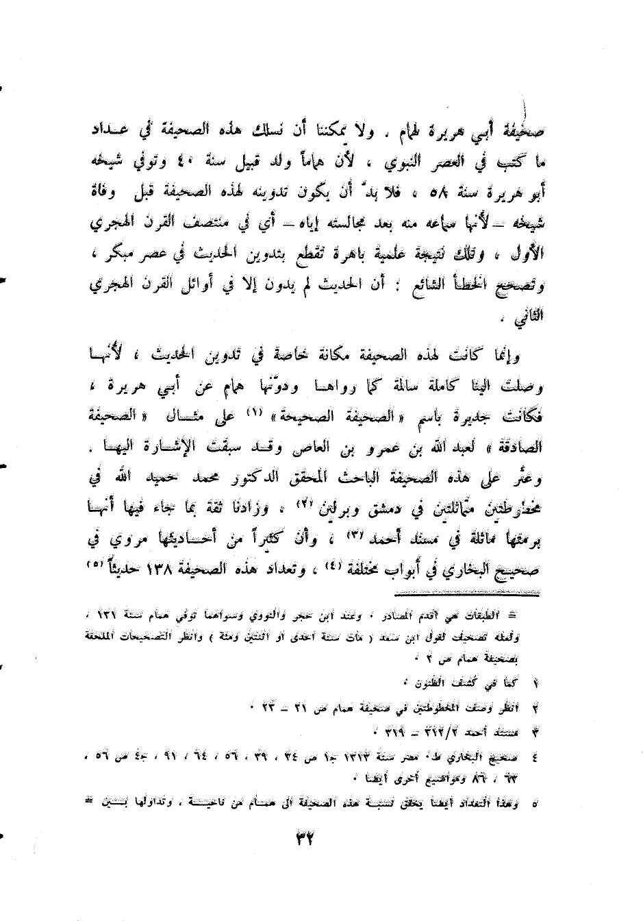 وإنما كانت لهذه الصحيفة مكانة خاصة في تدوين الحديث، لأنها وصلت إلينا كاملة سالمة كما رواها ودوَّنها همام عن أبي هريرة، فكانت جديرة باسم «الصحيفة الصحيحة» (¬1) على مثال «الصحيفة الصادقة» لعبد الله بن عمرو بن العاص وقد سبقت الإشارة إليها. وعثر على هذه الصحيفة الباحث المُحَقِّق الدكتور محمد حميد الله في مخطوطتين متماثلتين في دمشق وبرلين (¬2)، وزادنا ثقة بما جاء فيها أنها برُمَّتِها ماثلة في " مسند أحمد " (¬3)، وأنَّ كَثِيرًا من أحاديثها مروي في " صحيح البخاري " في أبواب مختلفة (¬4)، وتعداد هذه الصحيفة 138 حديثاً (¬5)