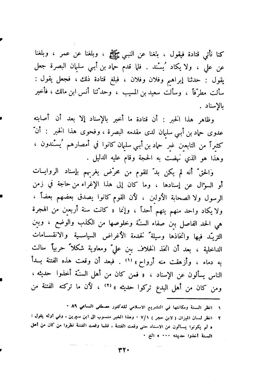 (¬2) انظر " لسان الميزان " (لابن حجر): 1/ 7. وهذا الخبر منسوب إلى ابن سيرين، وفي أوله يقول: «لَمْ يَكُونُوا يَسْأَلُونَ عَنِ الإِسْنَادِ، [فَلَمَّا] وَقَعَتِ الفِتْنَةُ قَالُوا: [سَمُّوا لَنَا رِجَالَكُمْ. فَيُنْظَرُ إِلَى أَهْلِ السُنّةِ] فَيُؤْخَذُ حَدِيثُهُمْ ... » الخ.