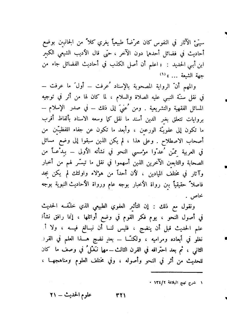 ونقول مع ذلك: إن التأثير العفوى الطبيعي الذي خَلَّفَهُ الحديث في أصول النحو، يوم فكر القوم في وضع أوائلها، إنما رافق نشأة علم الحديث قبل أن ينضج، فليس لنا أن نبالي فيه، ولا أن نغلو في أبعاده ومراميه، ولكنا - بعد نضج هذا العلم في القرن الثاني، ثم بعد احتراقه في القرن الثالث - مهما نَغْلُ في وصف ما كان للحديث من أثر في النحو وأصوله، وفي مختلف العلوم ومناهجها،
