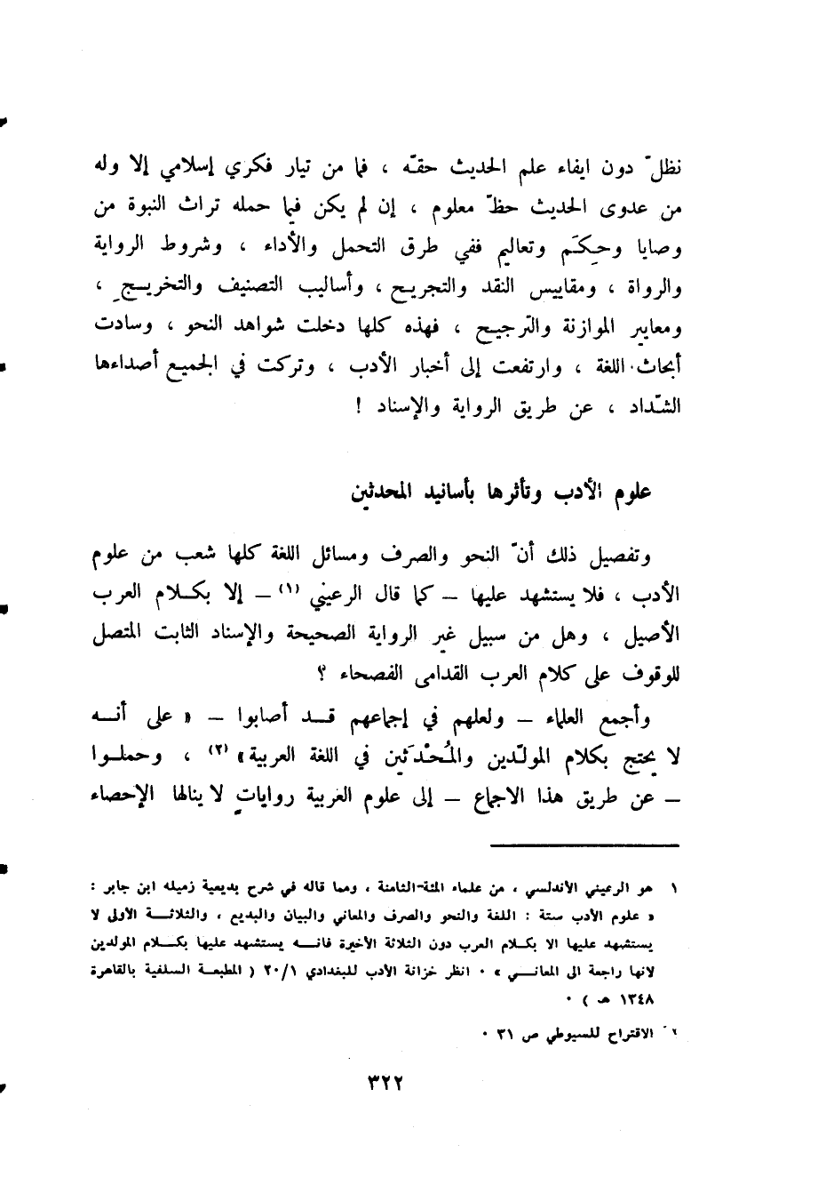 نَظَلُّ دون إيفاء علم الحديث حقة، فما من تيار فكري إسلامي إلا وله من عدوى الحديث حظ معلوم، إن لم يكن فيما حمله تراث النبوة من وصايا وَحِكَمٍ وتعاليم ففي طرق التحمل والأداء، وشروط الرواية والرواة، ومقاييس النقد والتجريح، وأساليب التصنيف والتخريج، ومعايير الموازنة والترجيح، فهذه كلها دخلت شواهد النحو، وسادت أبحاث اللغة، وارتفعت إلى أخبار الأدب، وتركت في الجميع أصداءها الشداد، عن طريق الرواية والإسناد!