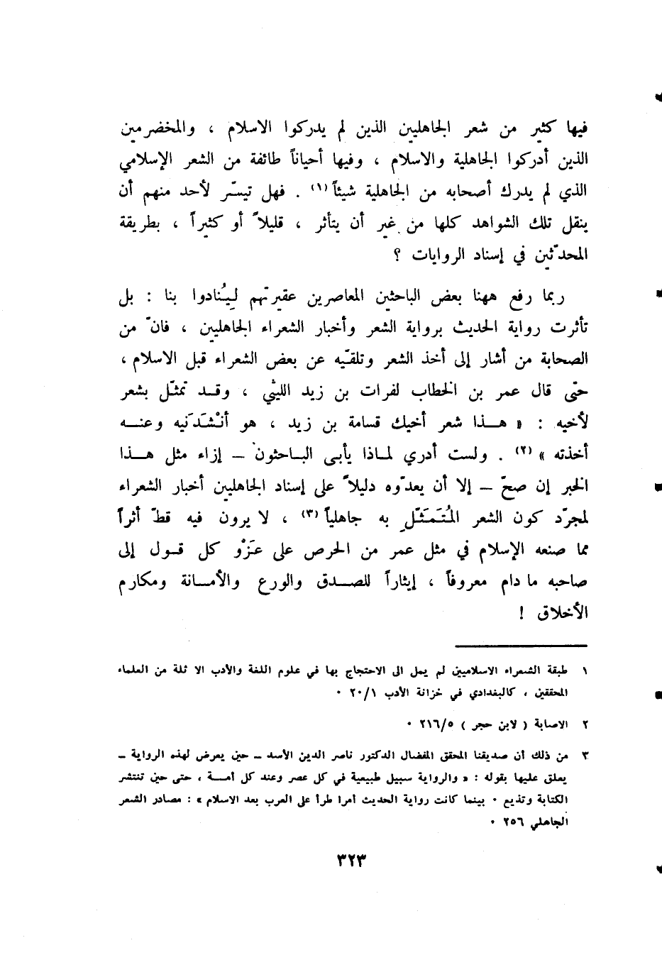 (¬3) من ذلك أن صديقنا المحقق المفضال الدكتور ناصر الدين الأسد - حين يعرض لهذه الرواية - يعلق عليها بقوله: «والرواية سبيل طبيعية في كل عصر وعند كل أمة، حتى حين تنتشر الكتابة وتذيع. بينما كانت رواية الحديث أمرًا طرأ على العرب بعد الإسلام». (" مصادر الشعر الجاهلي ": ص 256).