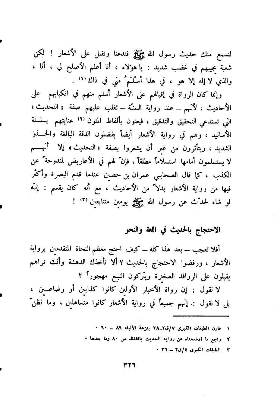 أفلا تعجب - بعد هذا كله - كيف احتج معظم النحاة المتقدمين برواية الأشعار، ورفضوا الاحتجاج بالحديث؟ ألا تأخذك الدهشة وأنت تراهم يقبلون على الروافد الصغيرة ويتركون النبع مهجورًا؟.