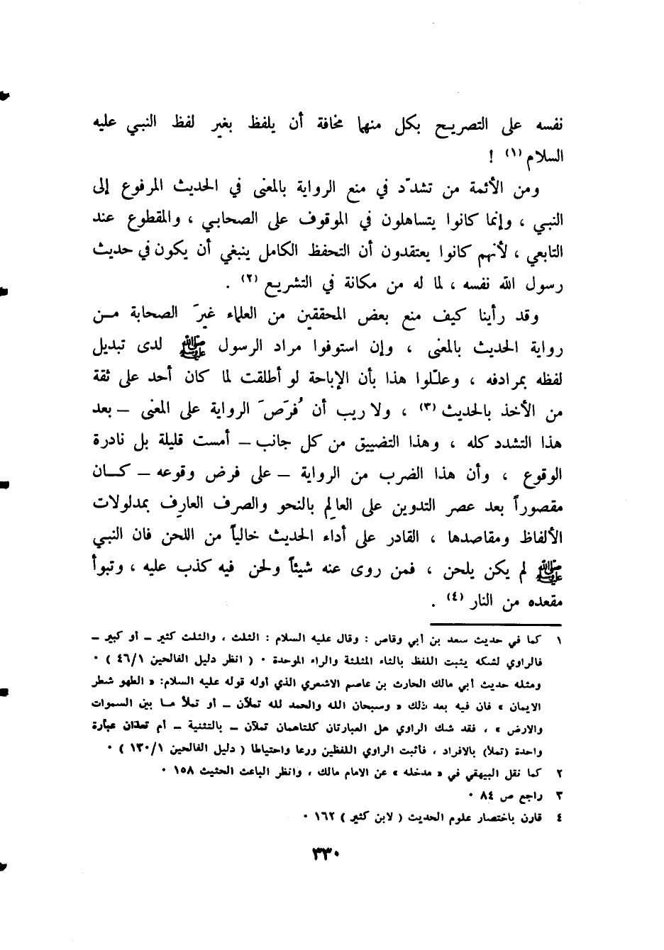 ومن الأئمة من تشدد في منع الرواية بالمعنى في الحديث المرفوع إلى النبي، وإنما كانوا يتساهلون في الموقوف على الصحابي، والمقطوع عند التابعي، لأنهم كانوا يعتقدون أن التحفظ الكامل ينبغي أن يكون في حديث رسول الله نفسه، لما له من مكانة في التشريع (¬2).