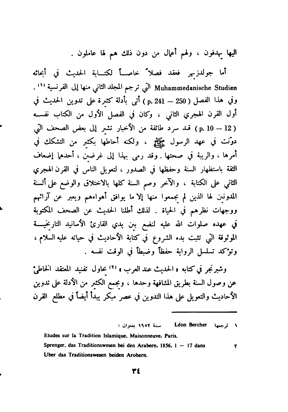 أما جولدتسيهر فعقد فصلاً خاصاً لكتابة الحديث في أبحاثه Muhammedanische Studien التي ترجم المجلد الثاني منها إلى الفرنسية (¬1). وفي هذا الفصل ( p. 241 - 250) أتى بأدلة كثيرة على تدوين الحديث في أول االقرن الهجري الثاني، وكان في الفصل الأول من الكتاب نفسه ( p. 10 - 12) قد سرد طائفة من الأخبار تشير إلى بعض الصحف التي دوَّنت في عهد الرسول - صَلََّى اللهُ عَلَيْهِ وَسَلَّمَ -، ولكنه أحاطها بكثير من التشكك في أمرها، والريبة في صحتها. وقد رمى بهذا إلى غرضين، أحدهما إضعاف الثقة باستظهار السُنَّة وحفظها في الصدور، لتعويل الناس في القرن الهجري الثاني على الكتابة، والآخر وصم السُنَّة كلها بالاختلاق، والوضع على ألسنة المدونين لها الذين لم يجمعوا منها إلاَّ ما يوافق أهواءهم ويعبر عن آرائهم ووجهات نظرهم في الحياة. لذلك أطلنا الحديث عن الصحف المكتوبة في عهده - صَلَوَاتُ اللهِ عَلَيْهِ - لنضع بين يدي القارئ الأسانيد التاريخية الموثوقة التي تثبت بدء الشروع في كتابة الأحاديث في حياته - عَلَيْهِ السَّلاَمُ -، وتؤكِّدَ تسلسل الرواية حفظاً وضبطاً في الوقت نفسه.