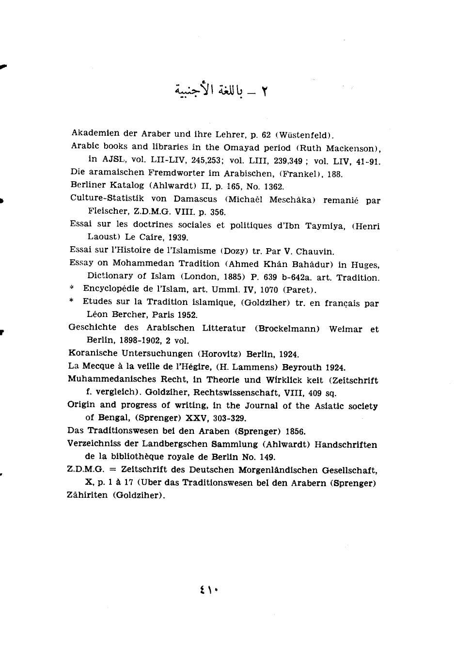 ,Z.D.M.G. = Zeitschrift des Deutschen Morgenlandischen Gesellschaft, X, p. 1 à 17 (Uber das Traditionswesen bel den Arabern (Sprenger) Zahiriten (Goldziher