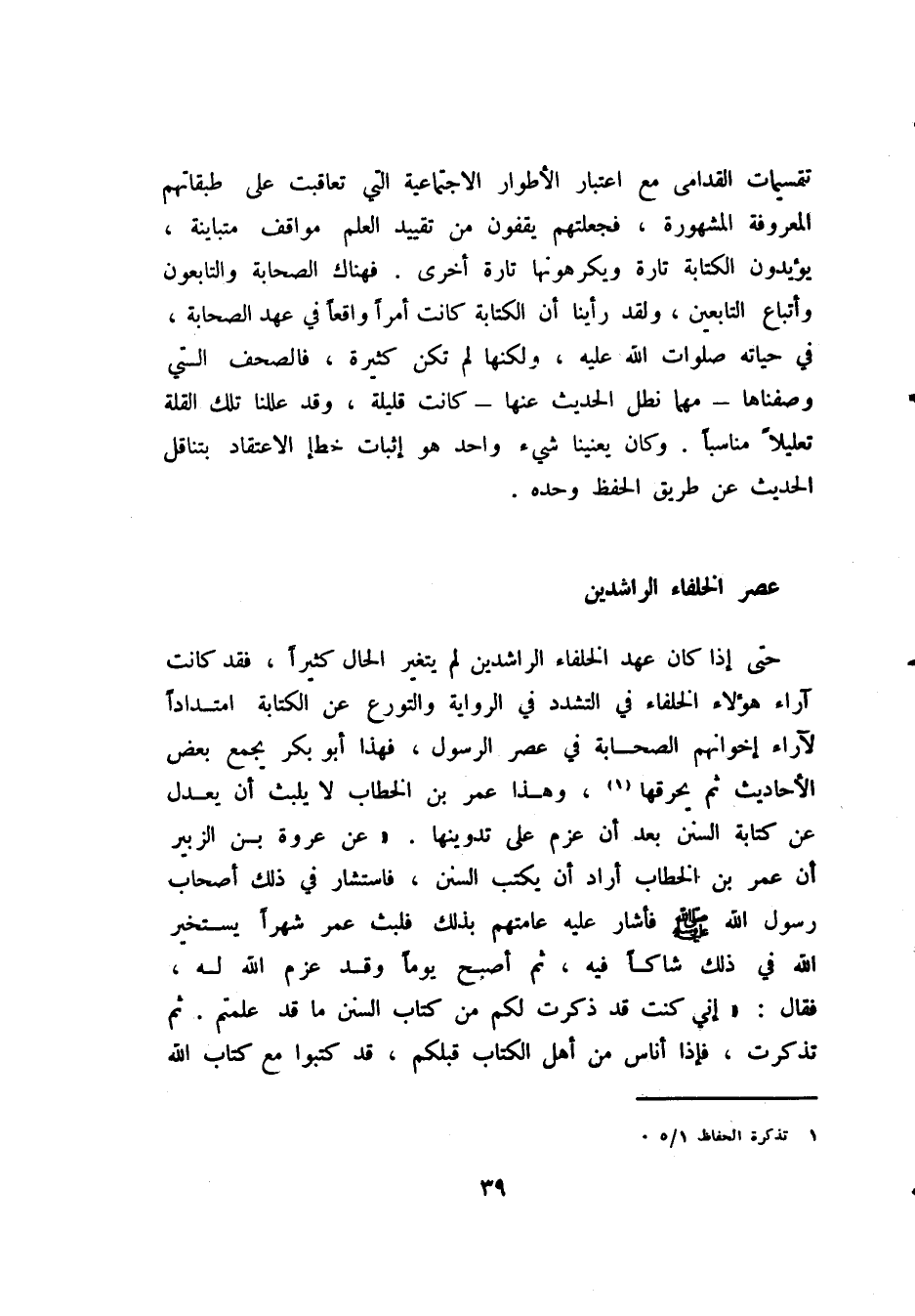 (¬3) " تقييد العلم ": ص 103 وانظر ما يقاربه في " جامع بيان العلم ": 1/ 72. وعلى هذا الأساس، يمكننا التوفيق بين قول كثير بن أفلح (- 63 هـ): «كنا نكتب عند زيد بن ثابت» - " تقييد العلم ": ص 102 وبين ما علمناه من رواية زيد بن ثابت حديث النهي عن الكتابة (راجع ما سبق أنْ ذكرناه في أول البحث).