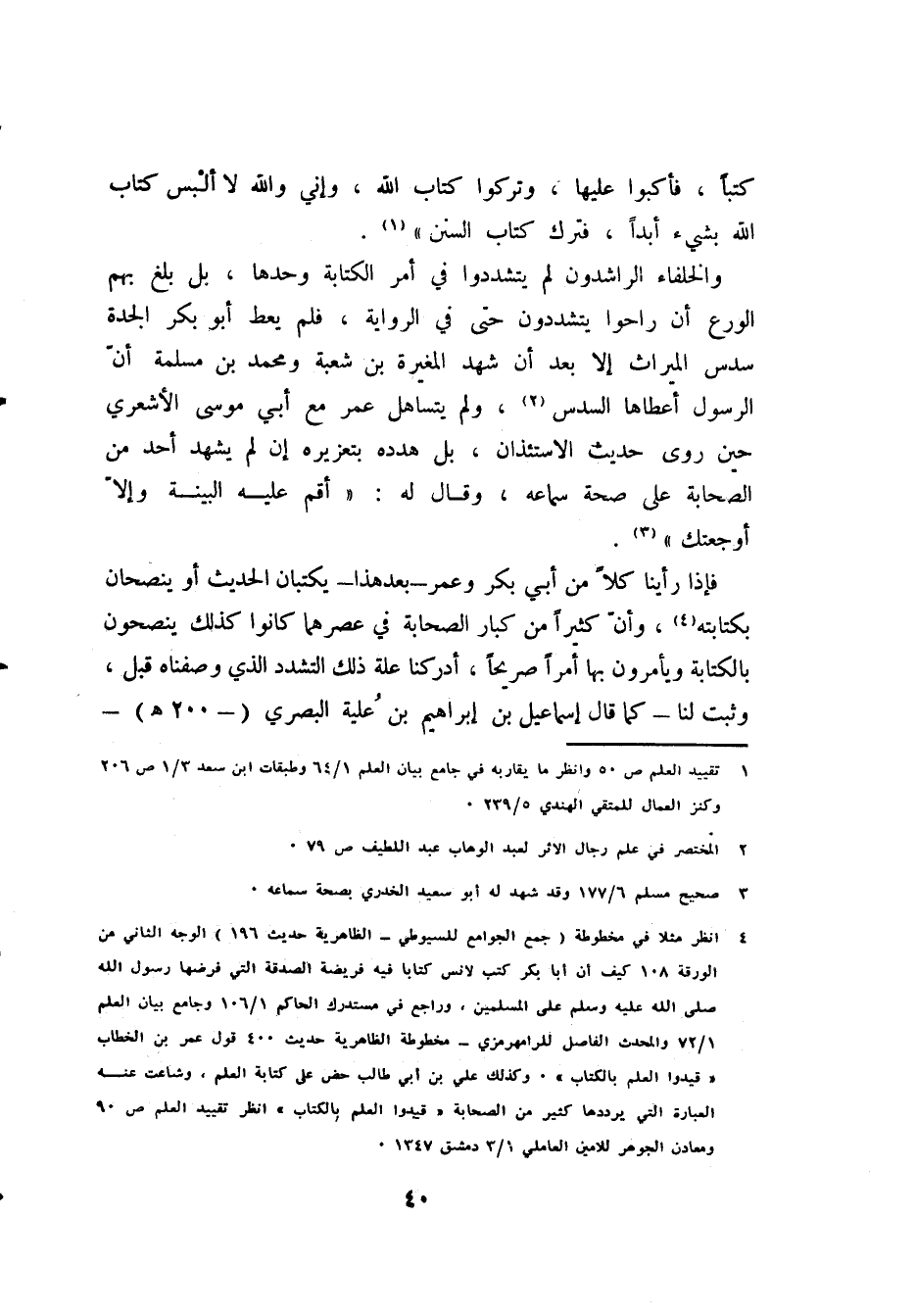 (¬2) " تقييد العلم ": ص 99 والعبارة المشهورة عن الرسول في هذا هي كما رأينا «قيِّدُوا العِلْمَ بِالكِتَابِ».