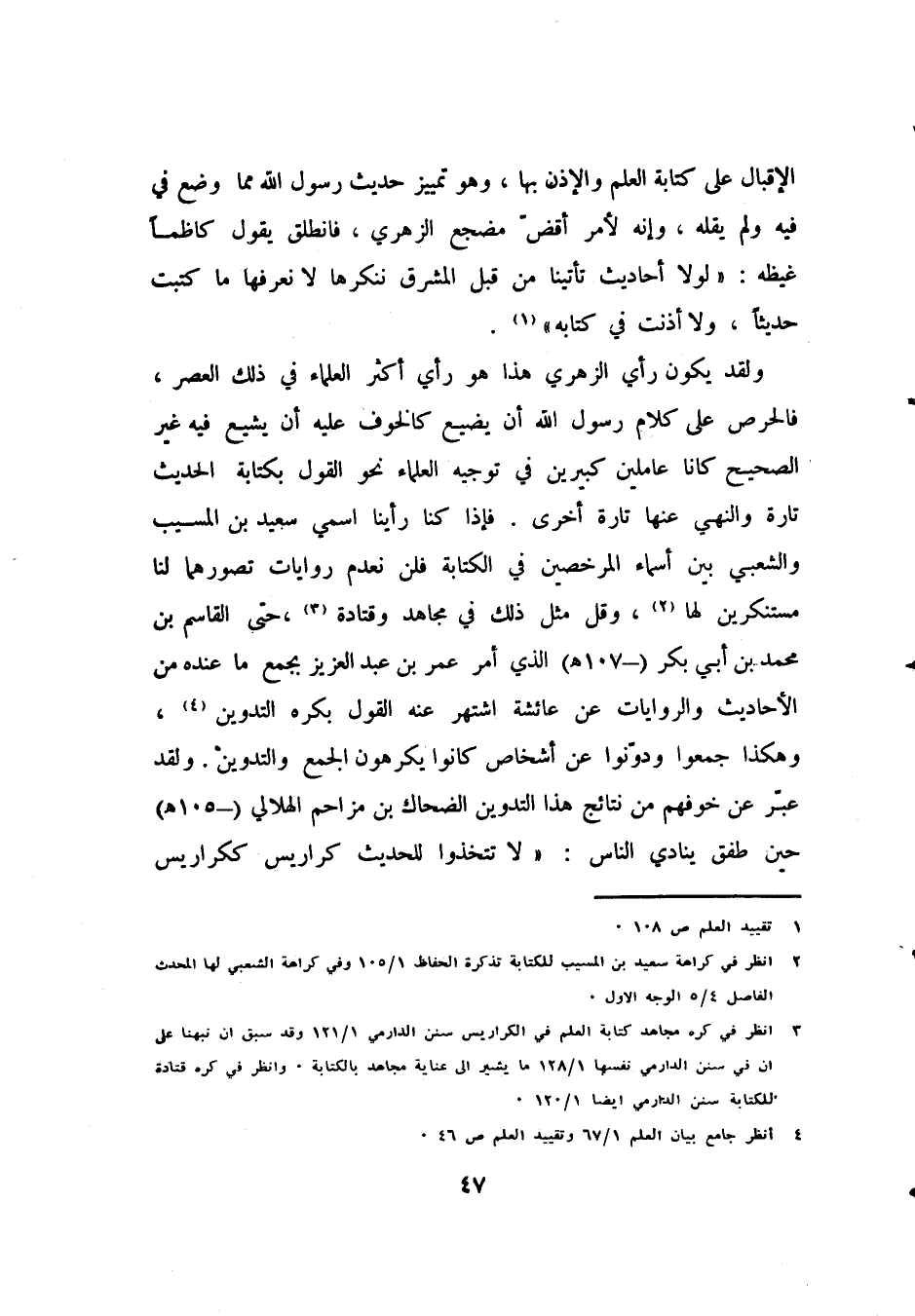 (¬2) وذلك يعني أنَّ السماع في المدينة كان أكثر منه في مكة، وهو ما قصده المؤرِّخُون من وصف المدينة بأنه «دَارُ السُنَّةِ» فلا ينبغي أن يستنتج من كلامنا تحديد أي البلدين كان له السبق في تدوين الحديث، فالسماع بالتلقين غير الكتابة مع التدوين.