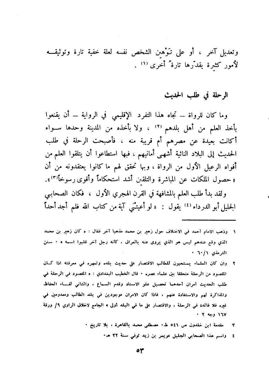 (¬2) لأنَّ العلماء - بتنقلهم في الأمصار الإسلامية - لم يجدوا الفرصة للاستقرار في بلدهم ن فبينا يكون أحدهم في العراق إذا هو في الشام، وما يكاد يحل في الشام حتى يرحل إلى الأندلس، وفيما هو في الأندلس إذا هو في مصر. ويكثر في كتب الطبقات والتراجم نسبة الحافظ إلى بلده والإشارة إلى البلد الذي نزله: فنزار بن عبد العزيز بغدادي قدم مصر (" تاريخ بغداد ": 13/ 437) ونائل بن نجيح الحنفي بصري ورد بغداد (" تاريخ بغداد ": 13/ 434) وعلي بن معبد الرقي نزيل مصر (" [تذكرة] الحفاظ ": 2/ 550). والجوزجاني نزيل دمشق (" [تذكرة] الحفاظ ": 2/ 549) وابن واصل السدوسي البصري نزيل بغداد (" [تذكرة] الحفاظ ": 1/ 313) وعلي بن سعد العسكري نزيل الري (" [تذكرة] الحفاظ ": 2/ 749) وأحمد بن عبد الله العجلي الكوفي نزيل طرابلس الغرب (" الحفاظ ": 2/ 560) ومكي بن إبراهيم البلخي قدم بغداد (" [تاريخ] بغداد ": 13/ 118).