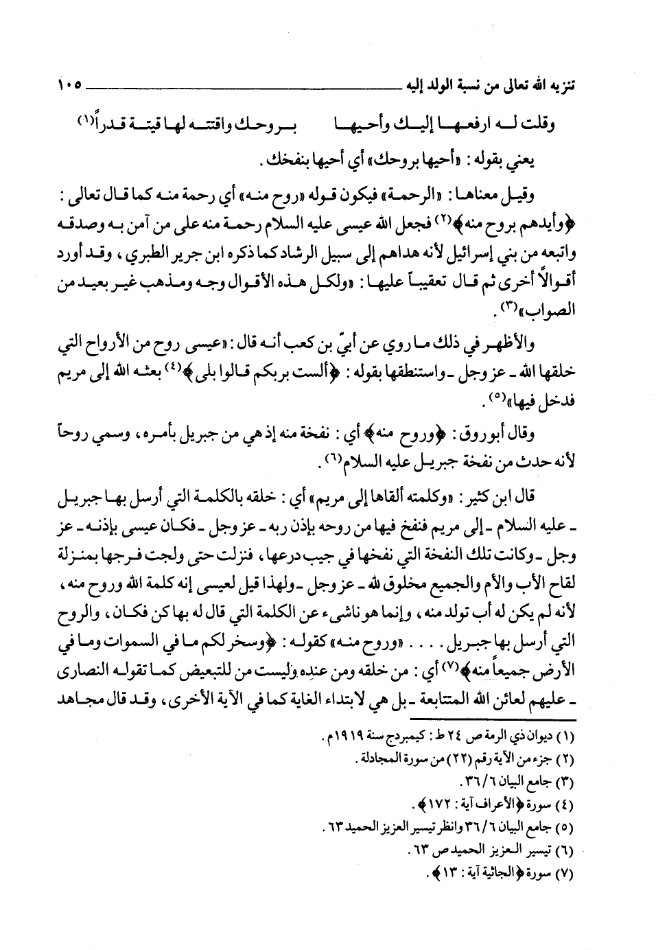 وجاء في قرة عيون الموحدين: قوله: {وَرُوحٌ مِنْهُ} أي: "من الأرواح التي استخرجها من صلب آدم عليه السلام، وأخذ عليها العهد على أنه ـ تعالى ـ ربهم وإلههم....، وروح عيسى من تلك الأرواح التي خلقها الله تعالى ... فجبريل نفخ والله خلق بقوله "كن فكان" كما قال تعالى: {فَإِذَا سَوَّيْتُهُ وَنَفَخْتُ فِيهِ مِنْ رُوحِي} 5 فسبحان من لا يخلق غيره ولا يعبد سواه" أ. هـ6.