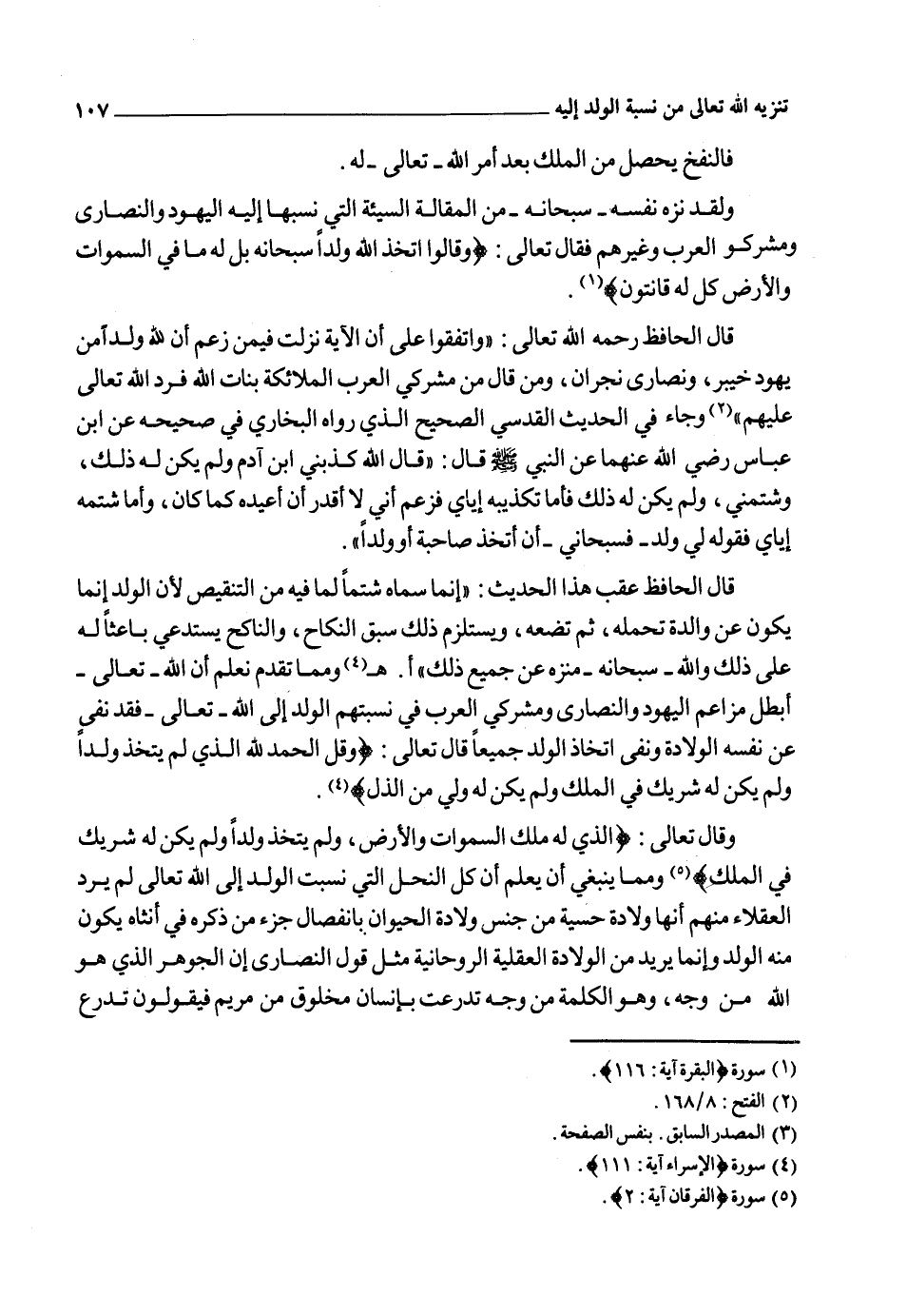 ولم يكتف القرآن بالرد على من زعم أن لله ولداً بالنفي فحسب بل كفر من جعل له ولداً، أو والداً، أو شريكاً فقال تعالى في السورة التي تعدل ثلث القرآن كما جاء بذلك الحديث الذي رواه أبو داود في سننه عن أبي سعيد الخدري أن رجلاً يقرأ: {قُلْ هُوَ اللهُ أَحَدٌ} يرددها فلما أصبح جاء إلى رسول الله صلى الله عليه وسلم فذكر ذلك له وكأن الرجل يتقالها فقال النبي صلى الله عليه وسلم: "والذي نفسي بيده إنها لتعدل ثلث القرآن" 2: {قُلْ هُوَ اللهُ أَحَدٌ اللهُ الصَّمَدُ لَمْ يَلِدْ وَلَمْ يُولَدْ وَلَمْ يَكُنْ لَهُ كُفُواً أَحَدٌ} . قال شيخ الإسلام: "فنفى عن نفسه الأصول والفروع والنظراء، وهي جماع ما ينسب إليه من المخلوق من الآدميين والبهائم والملائكة، والجن، بل والنبات ونحو ذلك فإنه ما من شيء من المخلوقات إلا ولا بد أن يكون له شيء يناسبه إما أصل، وإما فرع، وإما نظير. أو اثنان من ذلك، أو ثلاثة وهذا في الآدميين والجن والبهائم ظاهر.