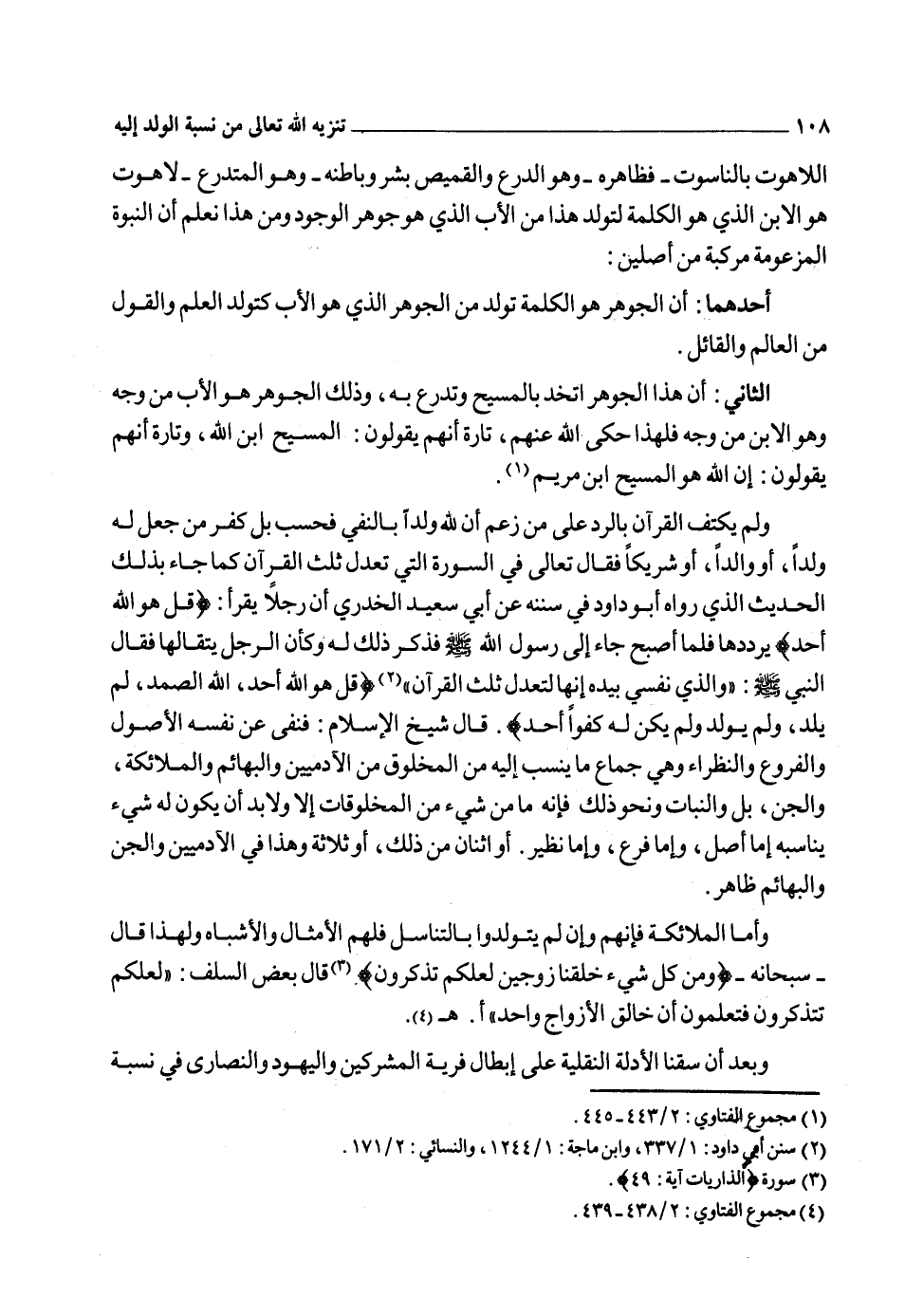 2 ـ إن الولد مشعر بكونه متولداً عن جزء من أجزاء الوالد وذلك إنما يعقل في من يمكن انفصال بعض أجزائه عن بعض وهو محال في حق الواجب لذاته1.