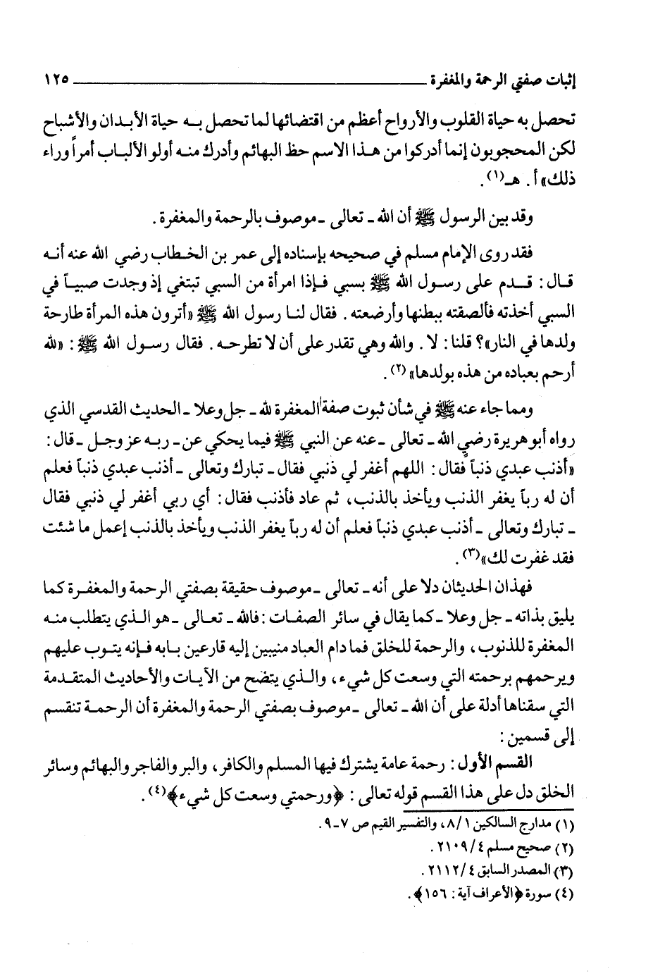 النوع الأول: من إضافة المفعول إلى فاعله ومثال هذا النوع الحديث الذي رواه البخاري عن أبي هريرة رضي الله تعالى عنه أن النبي صلى الله عليه وسلم قال: "احتجت الجنة والنار..... الحديث وفيه: "فقال للجنة إنما أنت رحمتي أرحم بك من أشاء من عبادي" 4 فهذه رحمة مخلوقة مضافة إليه إضافة المخلوق بالرحمة إلى خالقه، وسماها رحمة لأنها خلقت بالرحمة وللرحمة وخص بها أهل الرحمة، وإنما يدخلها الرحماء.
