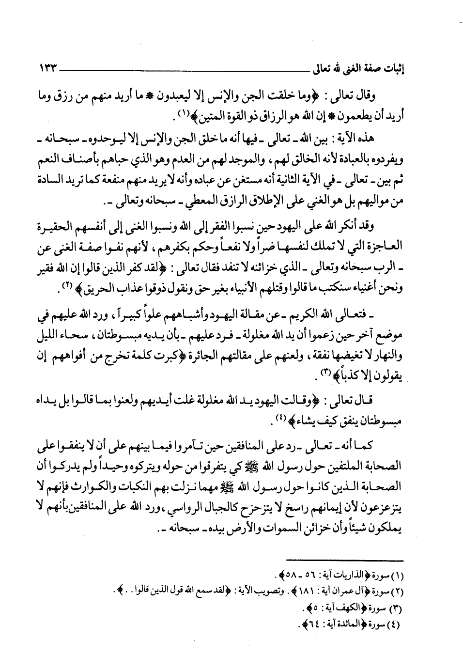 وبينت أنه ـ سبحانه ـ لم يخلق الخلق لحاجته إليهم، وأنه لو شاء لذهب بهم وأتى بغيرهم، وأخبر ـ تعالى ـ بأنهم فقراء إليه لا غنى لهم عنه في نفس من أنفاسهم وكلهم يعلم ذلك، مقرين به، وأنهم لم يكونوا موجودين حتى أوجدهم وليس لهم قدرة من أنفسهم ولا غيرها إلا بما أقدرهم الله عليه فإنه ـ سبحانه ـ الغني الفعال لما يريد، كما أن تلك الآيات تتضمن الرد على القائلين أن علة افتقار الخلائق إليه ـ سبحانه ـ إنما هو الحدوث فلا تحتاج إليه ـ سبحانه ـ إلا في حال الإحداث.