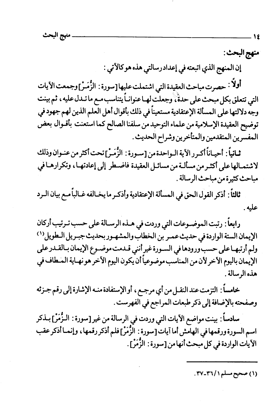 سابعاً: عزوت الأحاديث التي أوردتها في الرسالة إلى مصادرها الأصلية من كتب السنة المعتمدة بذكر الجزء والصفحة في الهامش مع بيان درجة الحديث من خلال أقوال المحدثين إن كان الحديث من غير الصحيحين في الغالب.