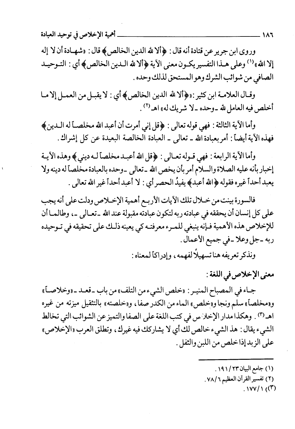 وقال تعالى في إخوة يوسف: {خَلَصُوا نَجِيّاً} 3. أي: انفردوا وتميزوا عمن سواهم. وقال تعالى حكاية عن المشركين: {خَالِصَةٌ لِذُكُورِنَا} 4 أي: لا يشركهم الإناث.