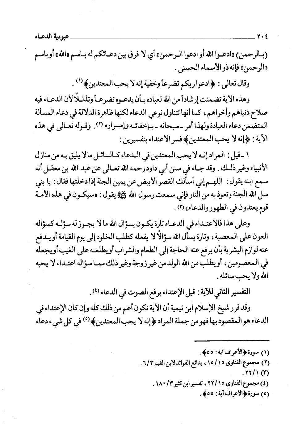 كان أو غيره كما قال تعالى: {وَلا تَعْتَدُوا إِنَّ اللهَ لا يُحِبُّ الْمُعْتَدِينَ} 1 وعلى القول بعموم الآية فإن من أعظم الاعتداء أن يدعي غير الله تعالى من المخلوقين سواء أكان الدعاء يوجه إليه مباشرة أو يدعون الله بهم كل ذلك اعتداء لا يحبه الله تعالى، لأنه وضع للعبادة في غير موضعها ومن الاعتداء أن يدعو الإنسان ربه تبارك وتعالى وهو غير مظهر للتضرع والتذلل فيكون دعاء هذا كدعاء المستغني المدل على ربه وهذا من الاعتداء الذي لا يحبه الله لمنافاته دعاء العبد المتذلل فمن لم يسأل ربه مسألة مسكين متضرع خائف فهو من المعتدين. كذلك من الاعتداء عبادة الله بما لم يشرعه ولا أذن فيه أو يثني على الله بما لم يثن به على نفسه. فذلك من الاعتداء في دعاء الثناء والعبادة وهو شبيه الاعتداء في دعاء المسألة والطلب قال شيخ الإسلام ابن تيمية: "وعلى هذا فتكون الآية دالة على شيئين: