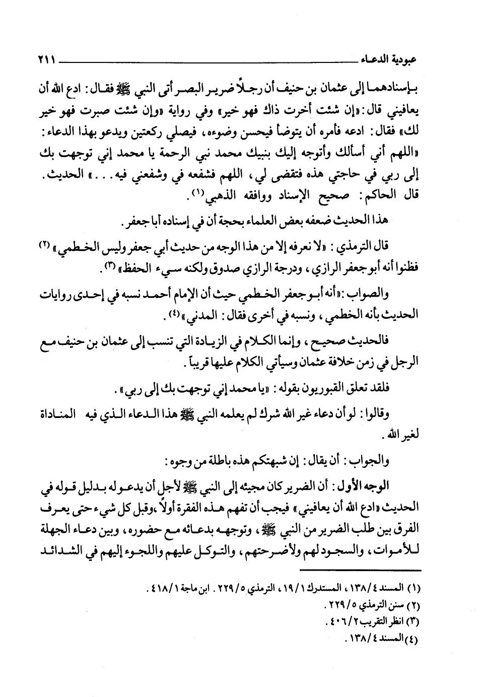 ومن حججهم التي احتجوا بها على جواز التوجه إلى القبور ودعاء أهلها ما أخرجه الطبراني من قصة الرجل مع عثمان بن عفان رضي الله عنه، من طريق عبد الله بن وهب عن شبيب بن سعيد المكي عن روح بن القاسم عن أبي جعفر الخطمي المدني عن أبي أمامة سهل بن حنيف أن رجلاً كان يختلف إلى عثمان بن عفان رضي الله عنه في زمن خلافته، فكان لا يلتفت إليه، ولا ينظر في حاجته فلقي عثمان بن حنيف فشكا ذلك إليه فقال عثمان: ائت الميضأة، فتوضأ، ثم ائت المسجد فصل فيه ركعتين، ثم قل: اللهم