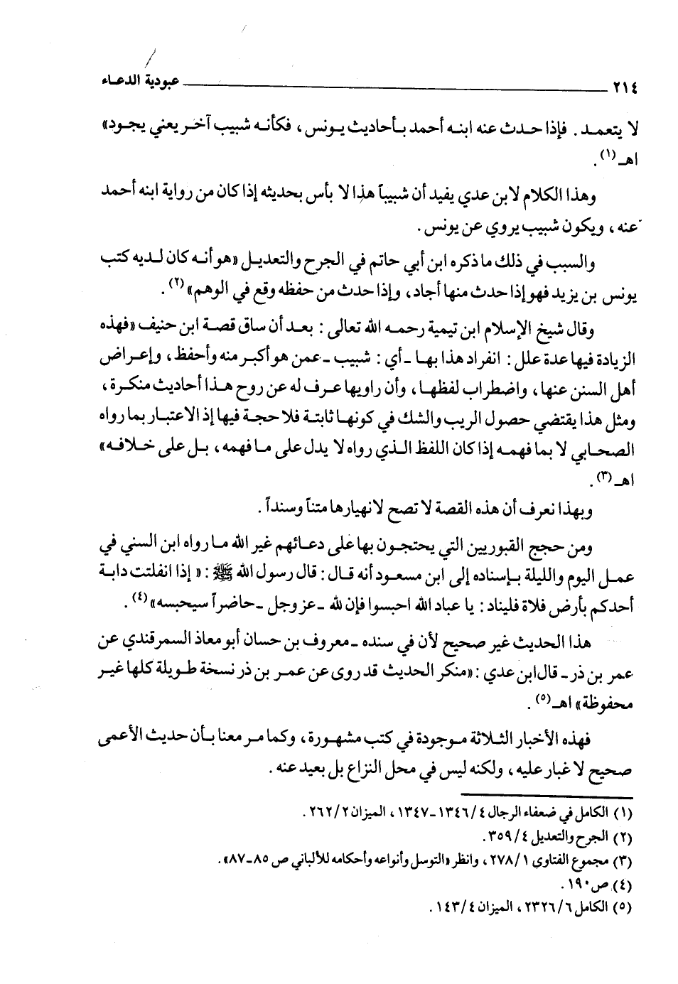 وأما قصة عثمان بن حنيف، والحديث الذي عند ابن السني لم يحظيا بالصحة بل هما باطلان، وما جاء به القبوريون بعد ذلك فإنما هو من اختلاقهم أنفسهم مثل حديث "إذا أعيتكم الأمور فعليكم بأصحاب القبور: وقد تقدم.