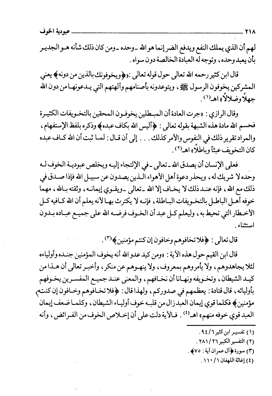 وهذه الآية فيها الأمر بإخلاص الخوف لله ـ تعالى ـ وكما أنه تعالى جعل الرجاء لأهل الأعمال الصالحة حيث قال تعالى: {إِنَّ الَّذِينَ آمَنُوا وَالَّذِينَ هَاجَرُوا وَجَاهَدُوا فِي سَبِيلِ اللهِ أُولَئِكَ يَرْجُونَ رَحْمَتَ اللهِ وَاللهُ غَفُورٌ رَحِيمٌ} 2 جعل كذلك الخوف لأهل الأعمال الصالحة إشارة منه ـ تعالى ـ أن الرجاء والخوف النافع هو ما اقترن به العمل الصالح.