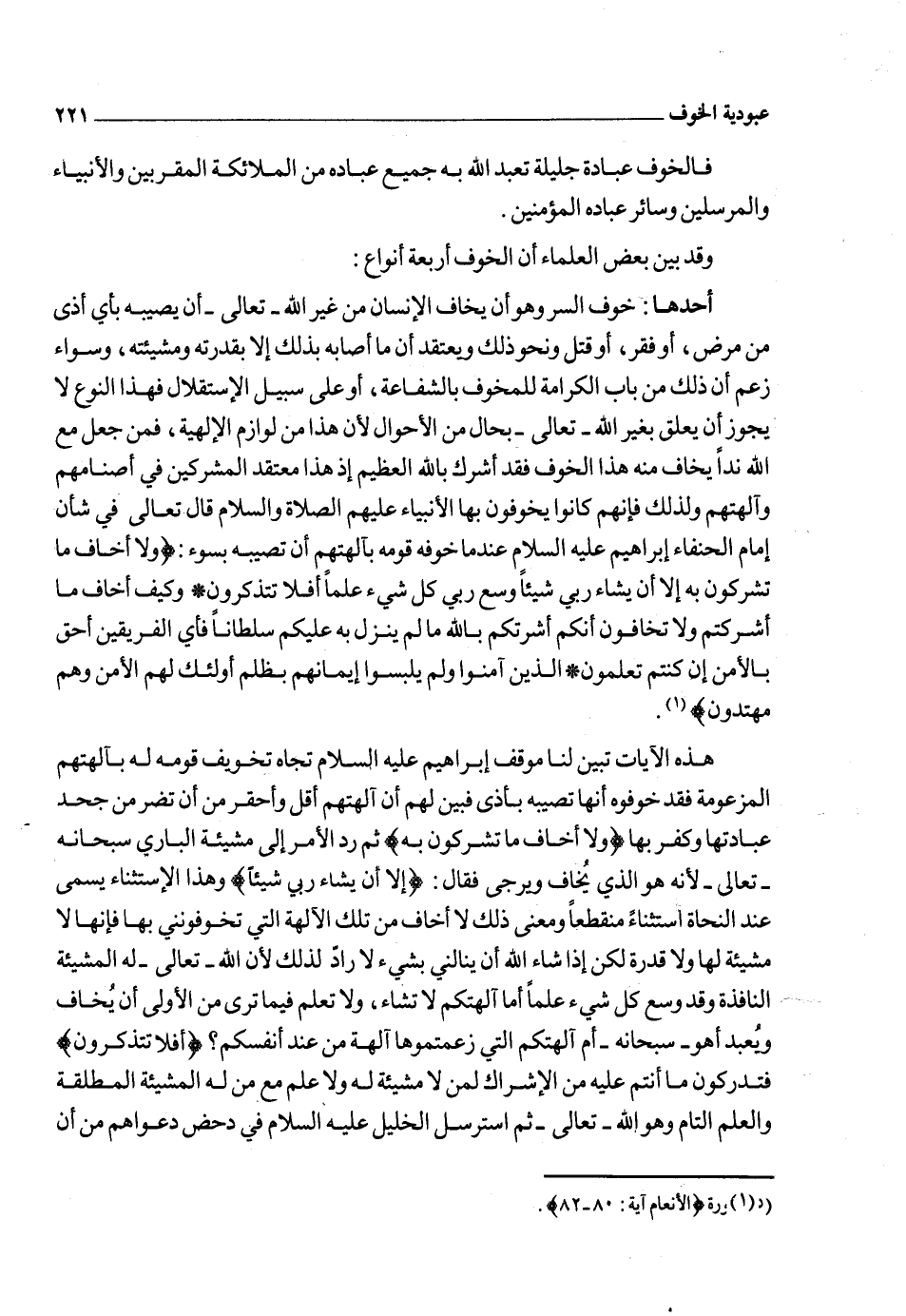 فلقد صدر الحكم بين الفريقين من عند أحكم الحاكمين وأعدل العادلين الذي لا أصح من حكمه فقال ـ عز شأنه: {الَّذِينَ آمَنُوا وَلَمْ يَلْبِسُوا إِيمَانَهُمْ بِظُلْمٍ} أي: بشرك1 {أُولَئِكَ لَهُمُ الأَمْنُ وَهُمْ مُهْتَدُونَ} فكان الحكم من قبل الله ـ تعالى ـ أن الهدى والأمن لأهل التوحيد، وحكم لفريق الشرك بالضلال والخوف بعكس ما حكم به لأهل التوحيد، وبذلك علت حجة أبينا إبراهيم على قومه كما قال تعالى: {وَتِلْكَ حُجَّتُنَا آتَيْنَاهَا إِبْرَاهِيمَ عَلَى قَوْمِهِ نَرْفَعُ دَرَجَاتٍ مَنْ نَشَاءُ إِنَّ رَبَّكَ حَكِيمٌ عَلِيمٌ} 2 وقال تعالى في قصة هود عليه السلام عندما خوفه قومه بالآلهة: {إِنْ نَقُولُ إِلاَّ اعْتَرَاكَ بَعْضُ آلِهَتِنَا بِسُوءٍ قَالَ إِنِّي أُشْهِدُ اللهَ وَاشْهَدُوا أَنِّي بَرِيءٌ مِمَّا تُشْرِكُونَ * مِنْ دُونِهِ فَكِيدُونِي جَمِيعاً ثُمَّ لا تُنْظِرُونِ} 3. هاتان الآيتان بين الله فيهما موقف هود عليه السلام من مقالة قومه له حينما نصح لهم في الدعوة إلى توحيد الله وتصديقه وخلع الأوثان والتبرؤ منها ولما أيقنوا أن هوداً لا يتركهم من الدعوة إلى الله وإلى عبادته وحده لا شريك له حينذاك كان قولهم ما يحملك على ذم آلهتنا إلا أنه أصابك منها خبل وجنون فكان جواب هود عليه السلام لهم جواب من وثق بربه واعتمد عليه وأصبح لا يكترث بأي تخويف كان من غير الله ـ تعالى ـ فقال لهم: إني أشهد الله على نفسي، وأشهدكم أيضاً أيها القوم أنني بريء من هذه الآلهة التي أشركتموها مع الله في العبادة من دونه {فَكِيدُونِي جَمِيعاً} يقول: اعملوا كل حيلة أنتم وآلهتكم في ضري