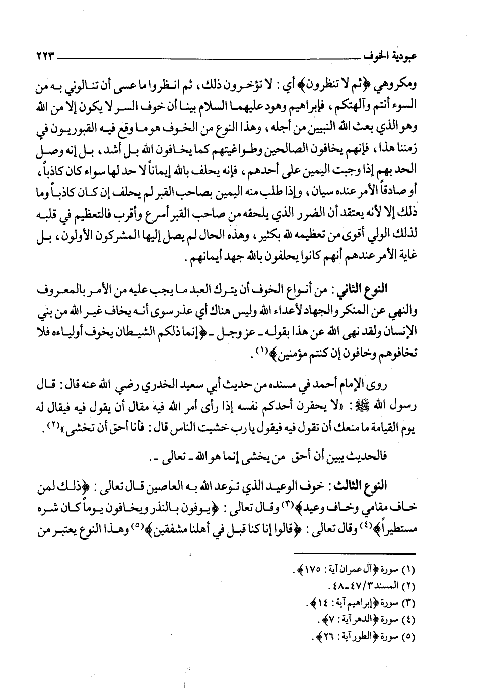 "وبعض الناس يقول يا رب إني أخافك وأخاف من لا يخافك، وهذا كلام ساقط لا يجوز، بل على العبد أن يخاف الله وحده، ولا يخاف أحداً لا من يخاف الله ولا من لا يخاف الله، فإن من لا يخاف الله أخس وأذل أن يخاف، فإنه ظالم وهو من أولياء الشيطان فالخوف منه قد نهى الله عنه" اهـ5.