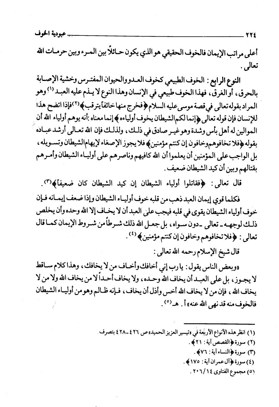 وقال تعالى: {إِنَّمَا يَعْمُرُ مَسَاجِدَ اللهِ مَنْ آمَنَ بِاللهِ وَالْيَوْمِ الآخِرِ وَأَقَامَ الصَّلاةَ وَآتَى الزَّكَاةَ وَلَمْ يَخْشَ إِلاَّ اللهَ} 1 دلت هذه الآية على أن خشية الله وحده دون أحد من خلقه من علامة صحة إيمان العبد بربه ـ تبارك وتعالى ـ.