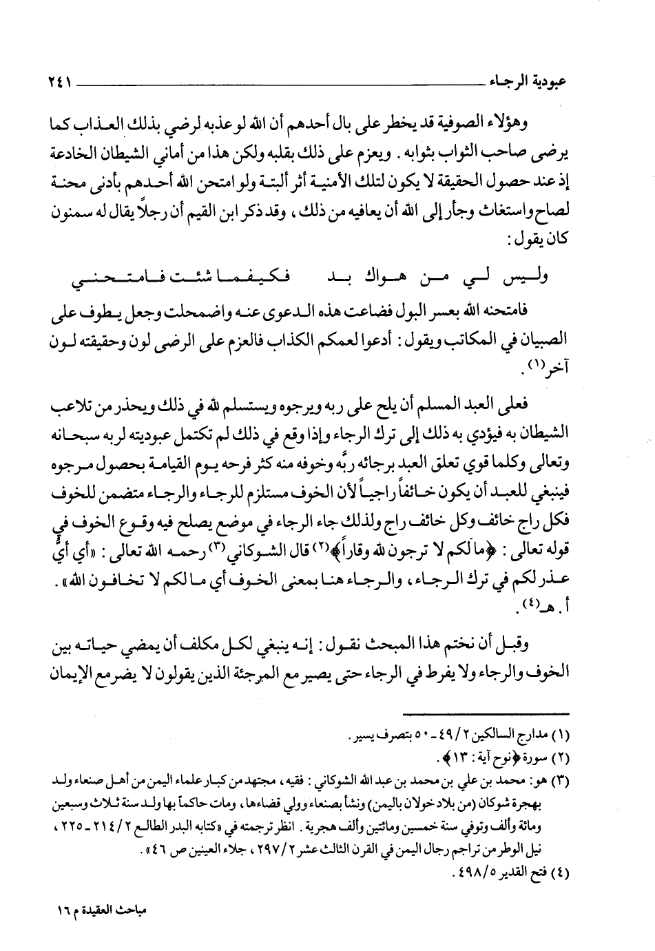 شيء ولا يوغل في الخوف حتى يكون في صف الخوارج والمعتزلة الذين قالوا إن صاحب الكبيرة مخلد في النار إذا مات ولم يتب بل عليه أن يلزم الطريق الوسط بينهما كما قال ـ عز وجل ـ {يَرْجُونَ رَحْمَتَهُ وَيَخَافُونَ عَذَابَهُ} 1 والذي يمعن النظر في دين الإسلام يجد قواعده أصولاً وفروعاً كلها في جانب الوسط وبالله التوفيق وهو المستعان.